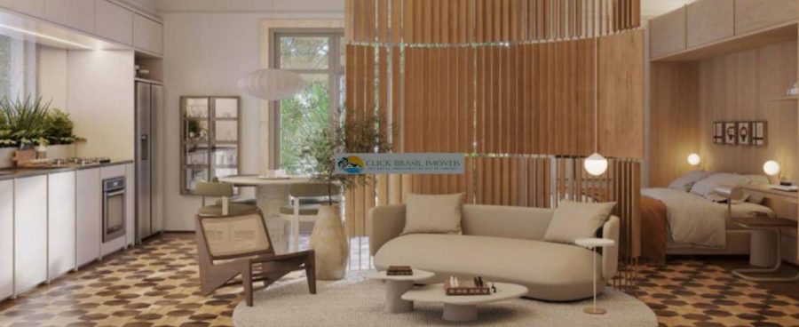 Sofisticação de morar em um studio com varandas confortáveis no estilo Art Déco.