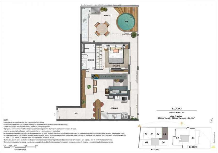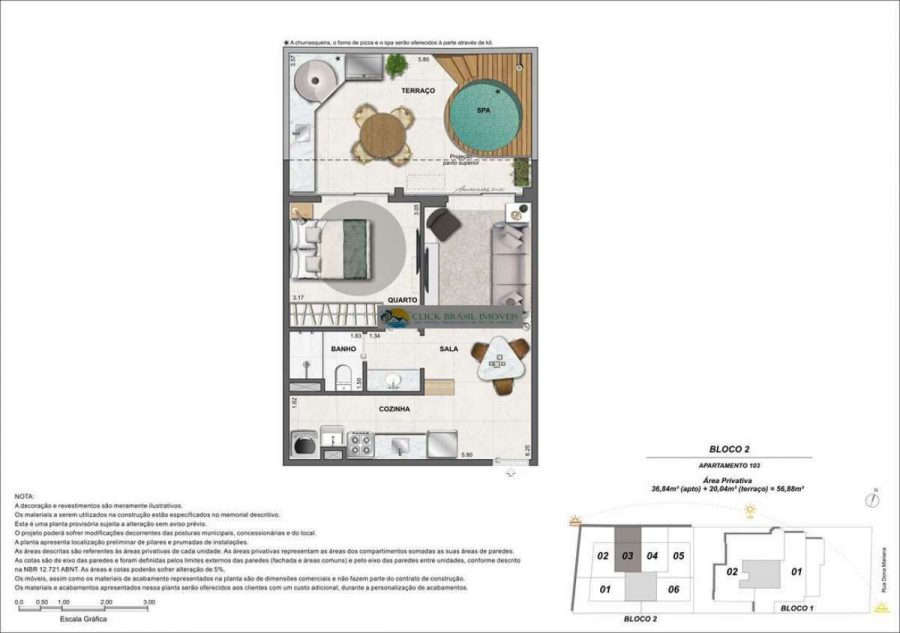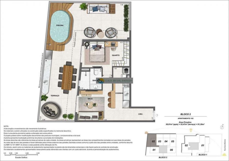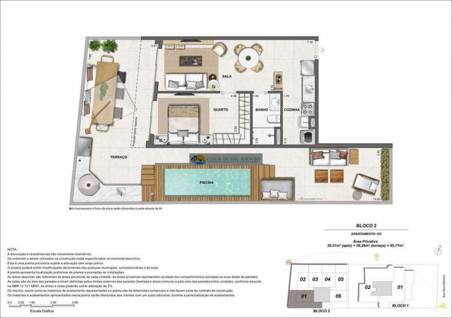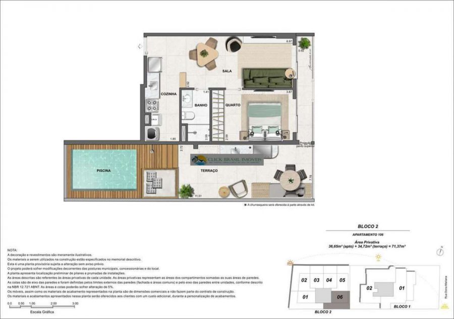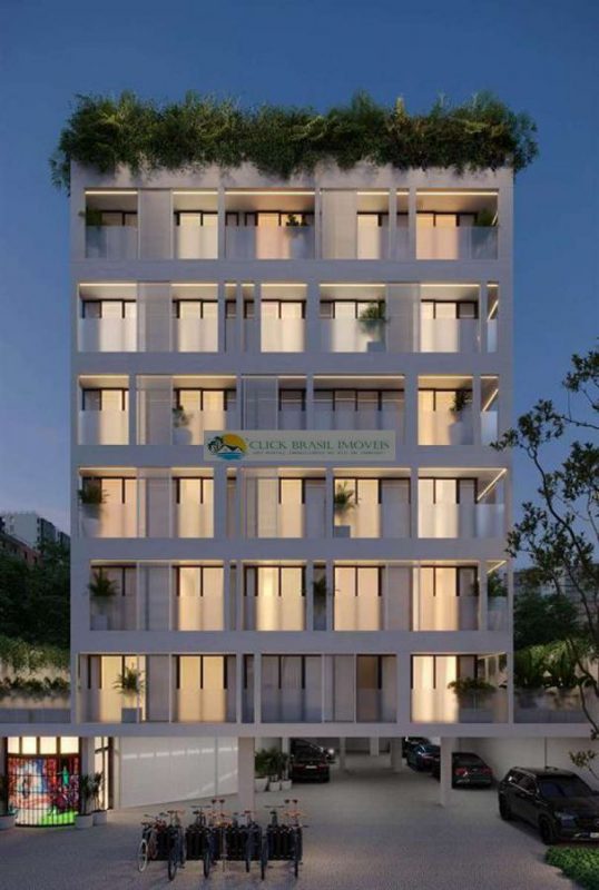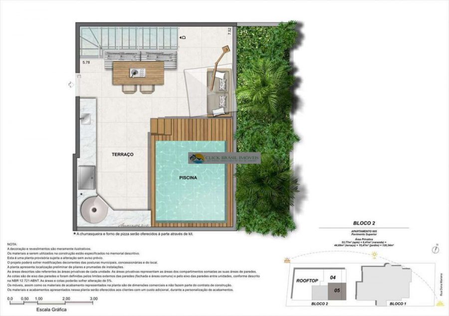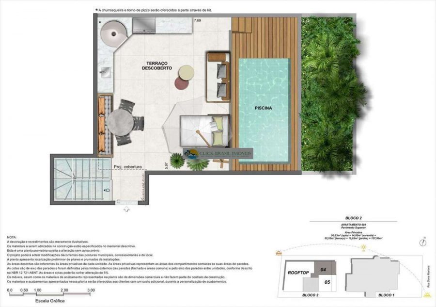 Bloco 02 do edifício Contemporâneo com 35 unidades sendo: 6 gardens sala e quarto. 27 unidades tipo sala quarto, 2 coberturas duplex 2 quartos, PUC no ROOFTOP: piscina, deck, academia e salão gourmet. Térreo com: Lavanderia compartilhada, bicicletário e garagem.