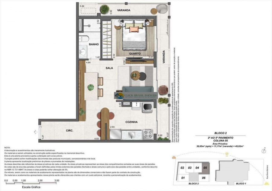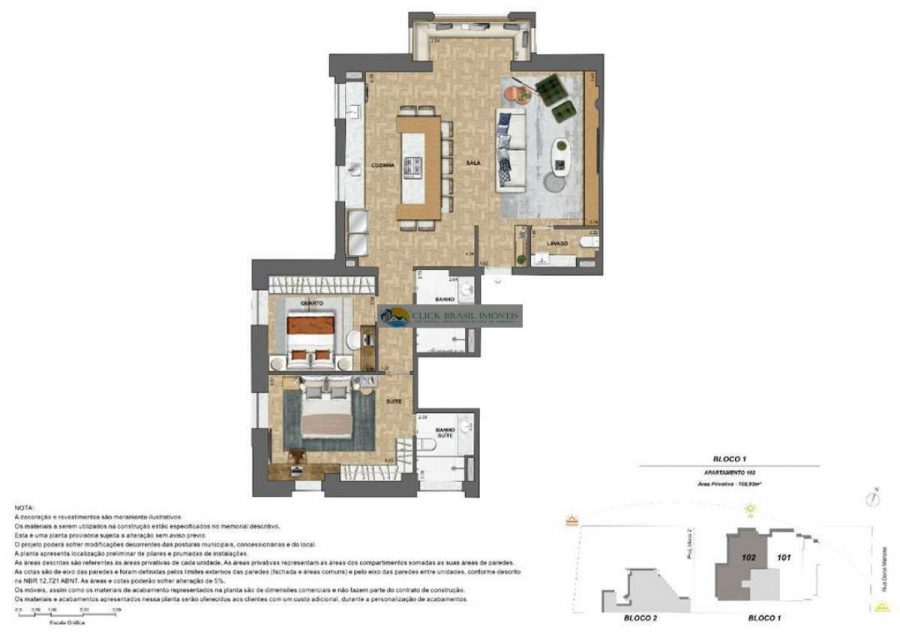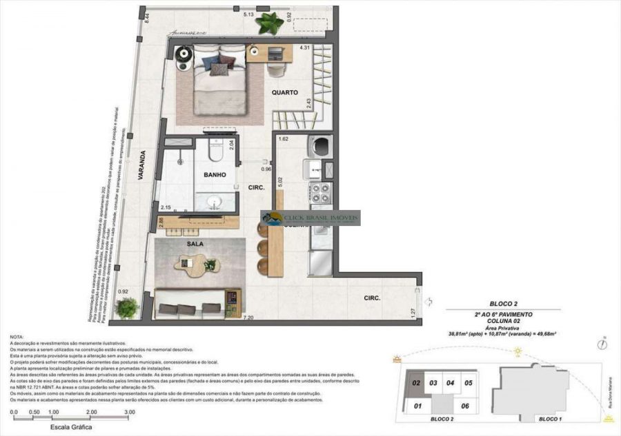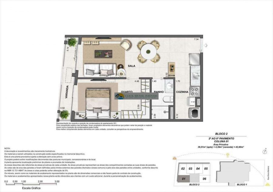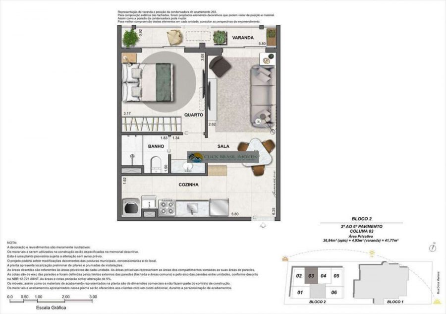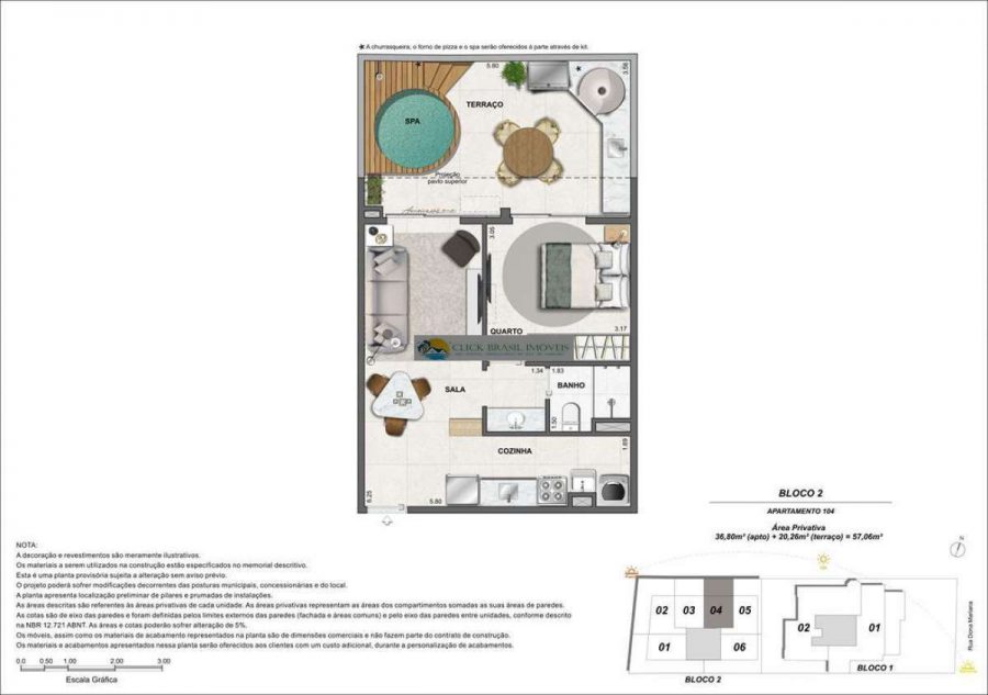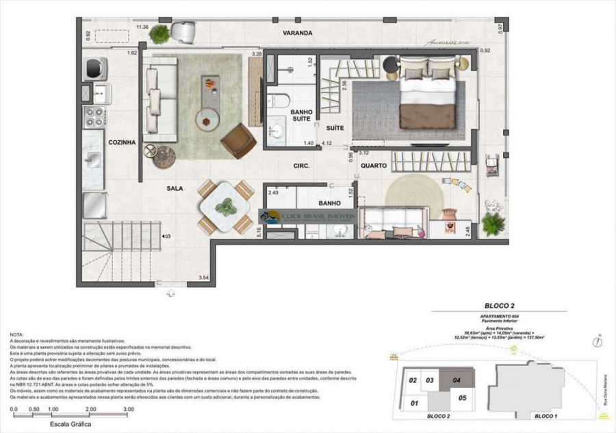 Bloco 02 do edifício Contemporâneo com 35 unidades sendo: 6 gardens sala e quarto. 27 unidades tipo sala quarto, 2 coberturas duplex 2 quartos, PUC no ROOFTOP: piscina, deck, academia e salão gourmet. Térreo com: Lavanderia compartilhada, bicicletário e garagem.